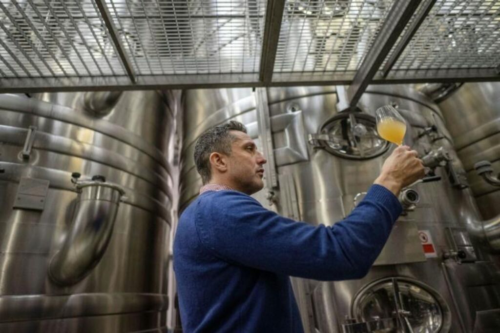 | Charlie Holland, patron du domaine viticole de Gusbourne, observe le jus sorti des cuves en inox, le 28 septembre à Appledore, près d'Ashford, dans le Sud-Est de l'Angleterre. |