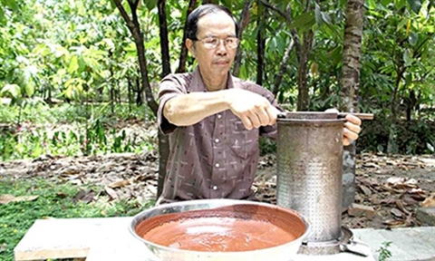 | M. Cuong transforme le vin de cacao à partir d’une partie extérieure de ses graines. |