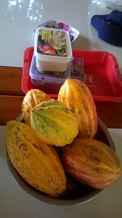 | Des cabosses et des produits transformés à partir des graines de cacao. |