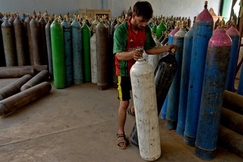 | Des bouteilles d'oxygène médical en partance pour des hôpitaux, à Jalalabad, en Afghanistan, le 11 juin. |