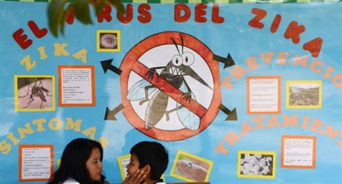 | Une mère et son enfant devant un panneau expliquant le virus Zika, le 26 février |