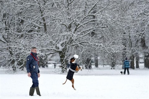 | Un homme joue avec son chien, le 24 janvier dans un parc près de Londres. |
