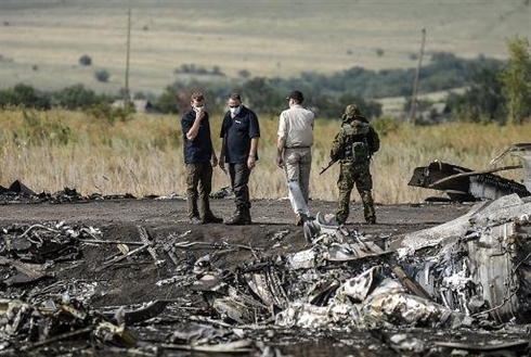 | Des enquêteurs inspectent le site du crash du vol MH17, le 25 juillet, près du village de Hrabove, à 80 km à l'est de Donetsk. |