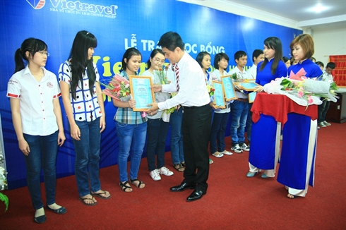 | Un représentant de Vietravel a remis des bourses scolaires à des élèves et étudiants dans le cadre du programme «Vietravel auprès des jeunes talents vietnamiens 2012» |