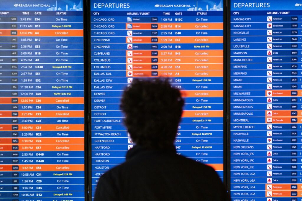 | Un tableau avec des vols annulés en raison de la tempête hivernale à l'aéroport national Reagan à Arlington en Virginie, le 23 décembre. |