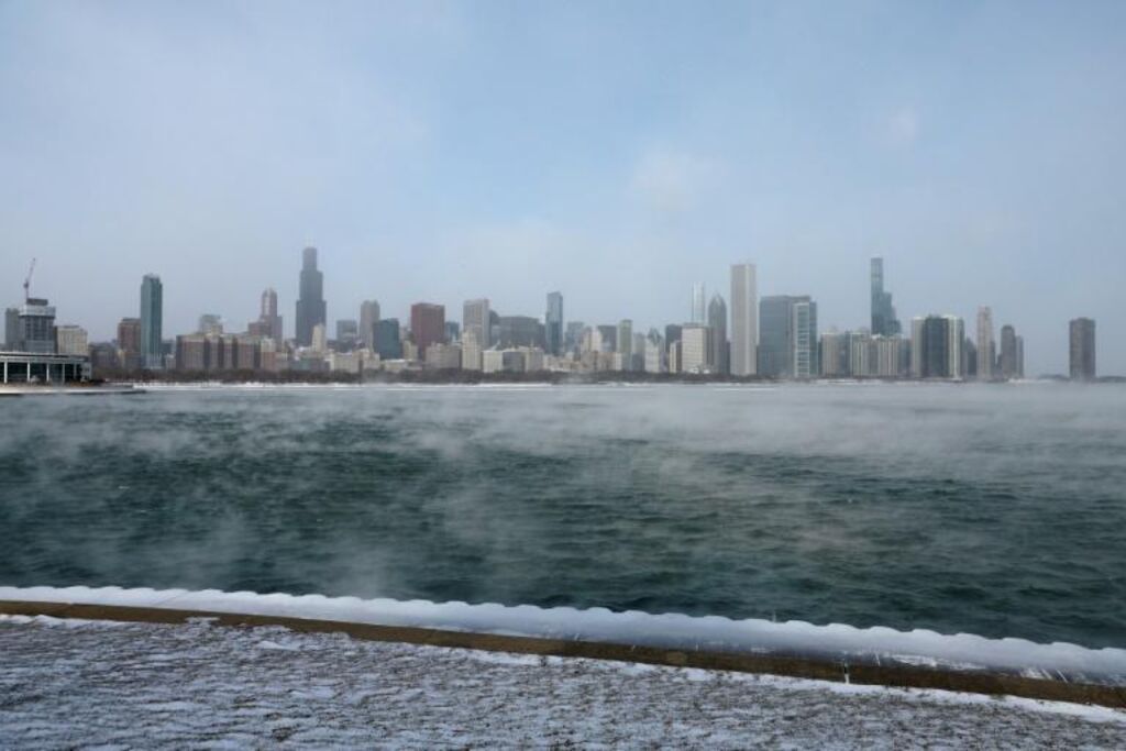 | De la vapeur au-dessus du lac Michigan, à Chicago, pendant une tempête hivernale le 23 décembre. |