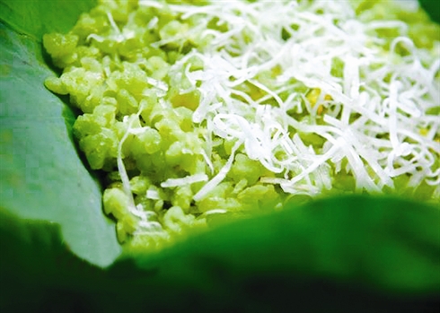 - Le côm est cuit à la vapeur jusqu’à ce qu’il devienne souple, puis mélangé avec un peu de sucre et cuit de nouveau à la vapeur. Mettez-le sur un plateau et laissez-le refroidir. Bien remuer puis ajouter les graines de lotus, fèves vertes et filaments de coco. Le xôi côm est généralement enveloppé dans une feuille de lotus pour qu’il conserve toute sa saveur et ne se dessèche pas.