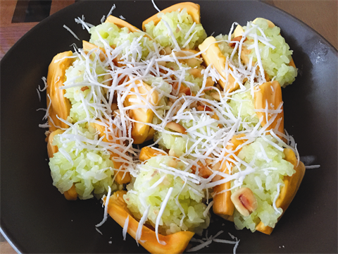 Mettre un peu de riz gluant déjà cuit dans le quartier de jaque évidé. Saupoudrer d’un peu de lamelles de noix de coco, de sésame torréfié et égrugé et, enfin, ajouter un peu de lait de coco.