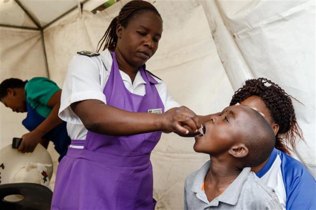 | Une agente de santé administre le vaccin contre le choléra aux enfants à Harare, au Zimbabwe. |