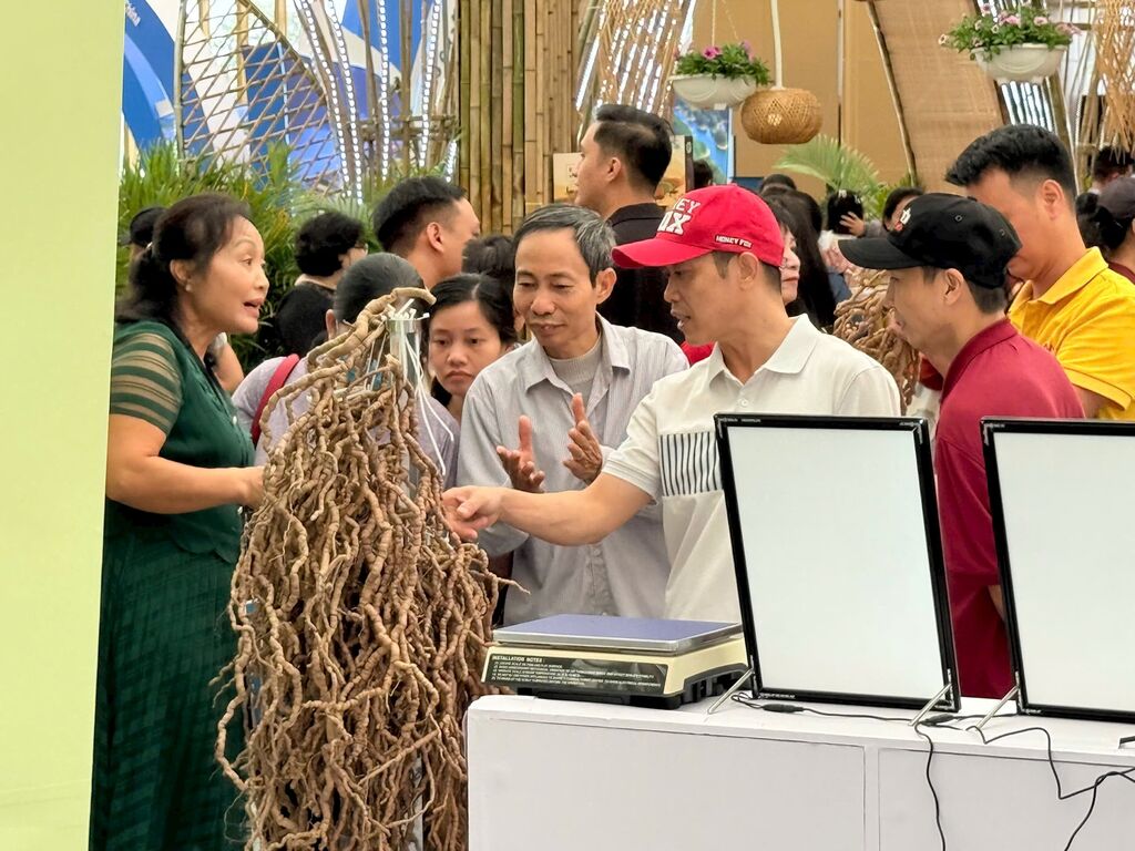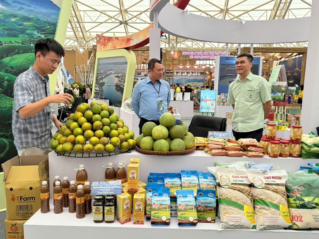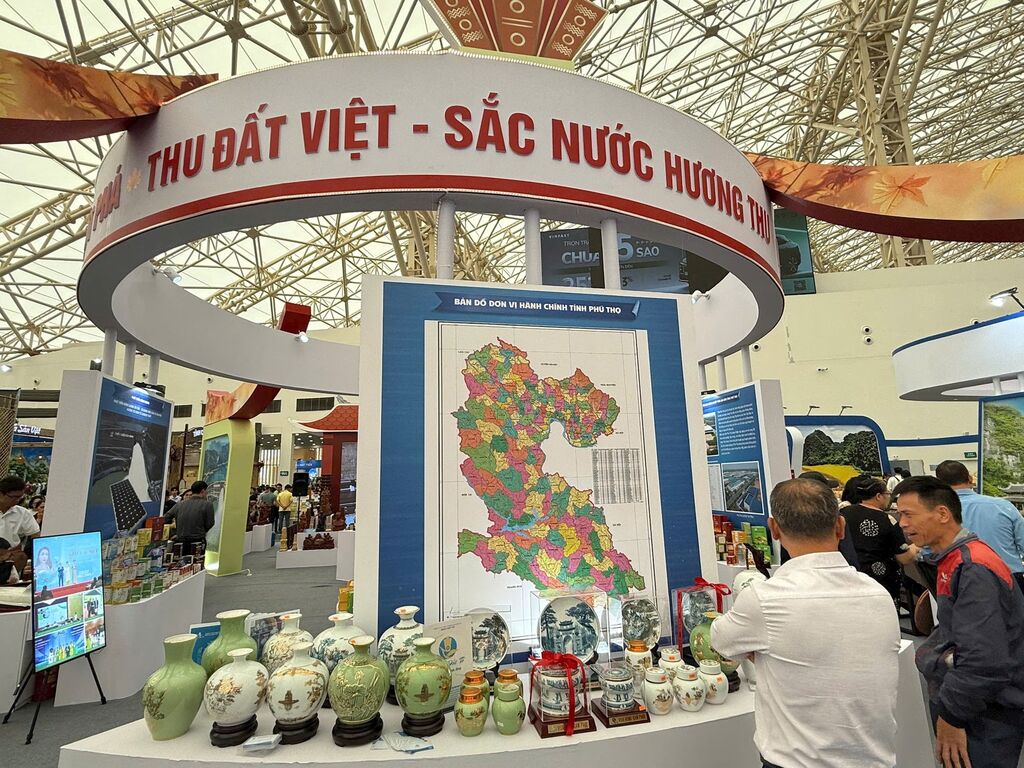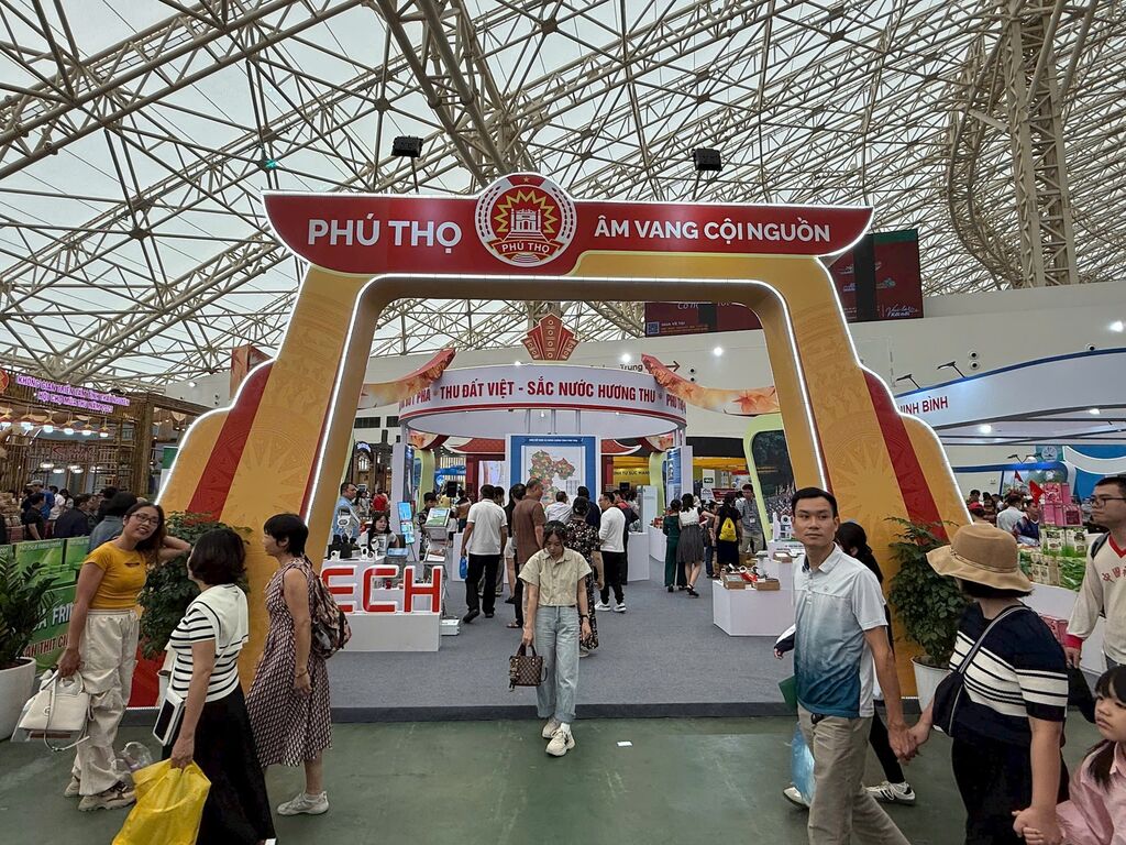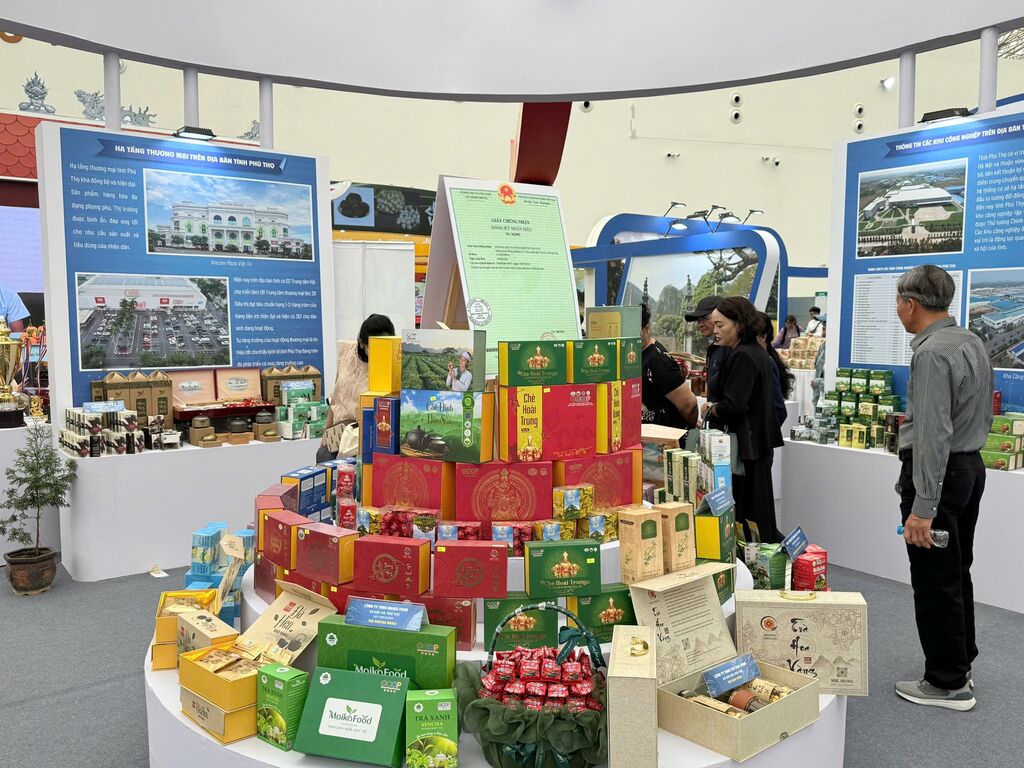 Ayant pour thème “L’écho des origines”, l’espace d’exposition de la province de Phu Tho (Nord) s’étende sur 200m² et présentait près de 300 produits emblématiques de plus de 60 entreprises et coopératives. Ces produits portent l’identité de la “Terre Ancestrale”, allant du groupe OCOP (À chaque commune son produit) et des produits industriels ruraux typiques tels que le thé Long Côc, le thé aux fleurs jaunes, les nouilles de riz de Hùng Lô, le banh chung (gâteau carré de riz gluant farci d’haricot et de viande de porc poivrée), le banh giây (pain de riz gluant cylindre), le pamplemousse de Doan Hùng, aux produits d’artisanat d’art tels que céramique, tableaux de pierres précieuses, brocarts...