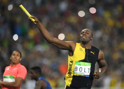 | La légende du sprint jamaïcain Usain Bolt célèbre la victoire de son relais 4x100 m aux Jeux de Rio, le 19 août. |