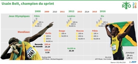 L'homme le plus rapide du monde s'est définitivement installé au panthéon des Dieux du sport, où il rejoint, outre le boxeur américain, Michael Phelps le nageur américain et ses 28 médailles (dont 23 en or), et Pelé, la star planétaire du foot brésilien.