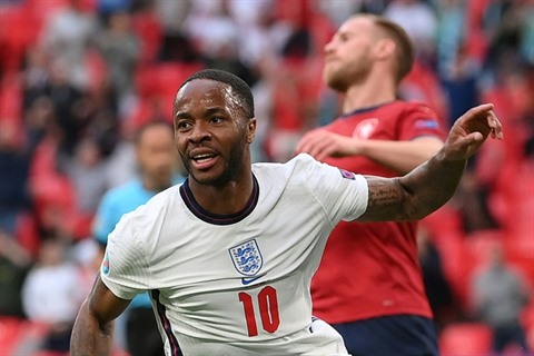| La joie de l’attaquant anglais Raheem Sterling, après avoir ouvert le score contre la République Tchèque, le 22 juin au stade de Wembley à Londres. |