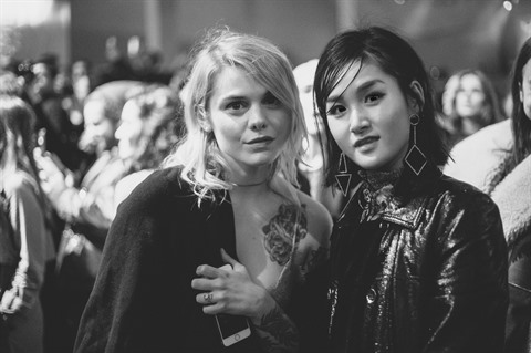 | Miu (droite) à côté de la chanteuse franco-canadienne Cœur de Pirate aux défilés de H&M à la Semaine de la mode à Paris 2017. |