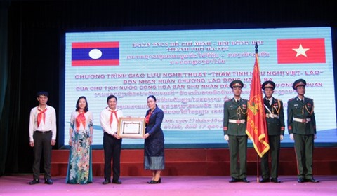 | Le représentant de l'école Lê Duân reçoit l’Ordre du Travail du Laos. |