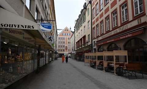 | Une rue de Munich, bordée de magasins et de restaurants fermés en raison de la pandémie de COVID-19, le 11 janvier. |