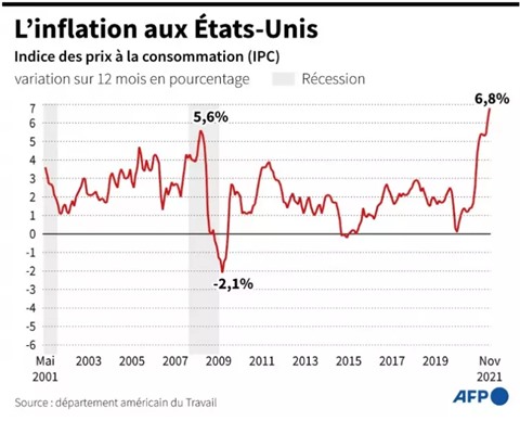 La hausse des prix sur un an, en effet, est au plus haut depuis 1982, avec une inflation annuelle en novembre de 6,8% selon l'indice CPI, et de 5,7% selon l'indice PCE, à cause, notamment, des prix de l'énergie, qui sont supérieurs de 34% à ceux de l'an passé.