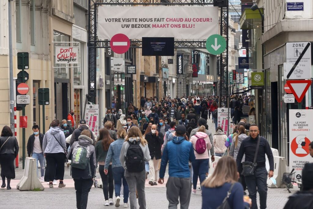 | Des gens marchent dans une rue commerciale à Bruxelles, en Belgique. |