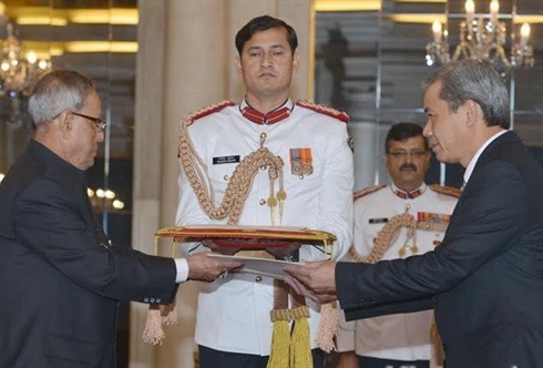 | Le nouvel ambassadeur du Vietnam en Inde, Tôn Sinh Thành (droite), présente sa lettre de créance, au président indien Pranab Mukherjee, le 21 octobre à New Delhi. |
