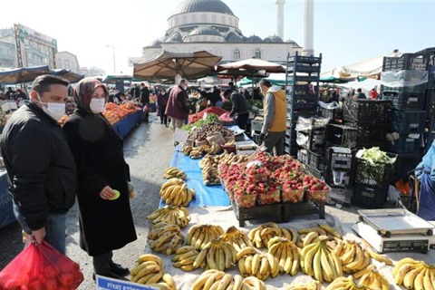 | Des personnes portant un masque font leurs courses sur un marché local d'Ankara le 22 février. |