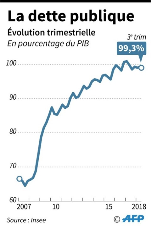 Mais tandis que la croissance patine, la dette publique de la France se rapproche à nouveau du seuil symbolique de 100% du PIB, atteignant 99,3% à la fin septembre. Trois mois plus tôt, elle était de 99%, et sur une pente descendante.