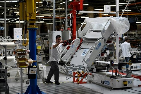 | Dans une usine de fabrication de lits médicalisés à Pluvigner, le 31 mars en France. |