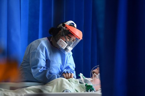 | Une soignante réconforte un patient atteint par le coronavirus, le 5 mai dans un hôpital de Cambridge, au Royaume-Uni. |
