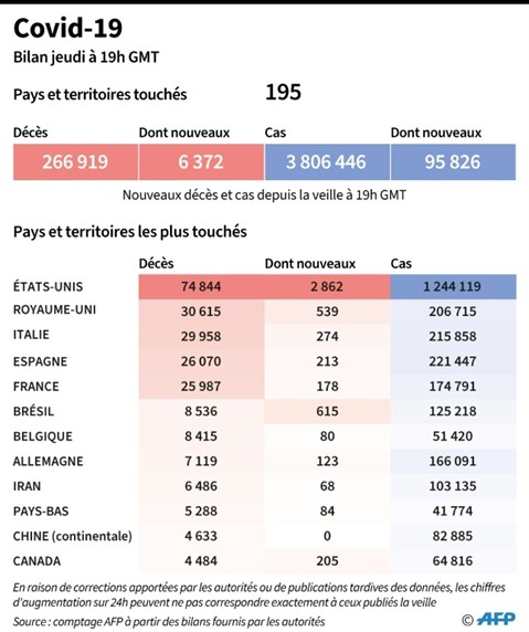 La pandémie a tué 266.919 personnes dans le monde, dont plus de 150.000 personnes en Europe : les trois quarts au Royaume-Uni (30.615), en Italie (29.958), en Espagne (26.070) et en France (25.987), selon un bilan établi par l’AFP à partir des chiffres de sources officielles, très vraisemblablement sous-estimés.