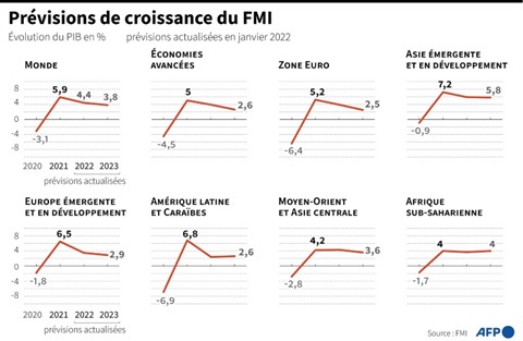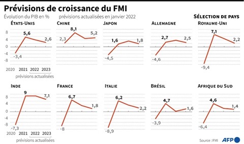 L'inflation devrait s'élever cette année en moyenne dans les économies avancées à 3,9% (+1,6 point) et dans les économies émergentes et en développement à 5,9% (+1 point), avant de ralentir en 2023, a détaillé le FMI.