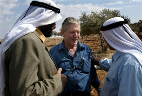 | L'écrivain israélien Amos Oz discute avec des Palestiniens après la récolte d'olives à Aqraba, en Cisjordanie |