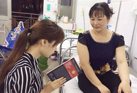 | Une lectrice lit un livre à une patiente dans un hôpital à Hô Chi Minh-Ville. |