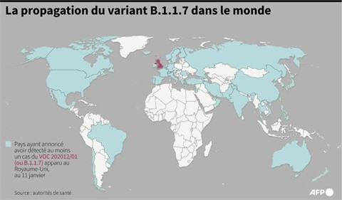 | Carte montrant les pays ayant déjà enregistré un cas du nouveau variant du coronavirus détecté au Royaume Uni. |