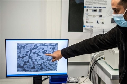 | Image du variant britannique du nouveau coronavirus, qui cause la maladie du COVID-19, sur un écran à l'IHU à Marseille, le 11 janvier. |