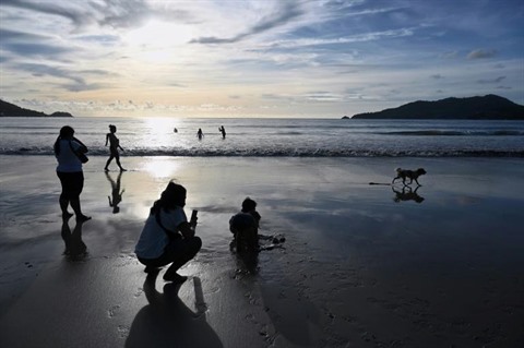 | Des gens marchent sur la plage Patong à Phuket (Thaïlande), quelques jours avant l'ouverture de l'île aux touristes vaccinés, le 29 juin. |