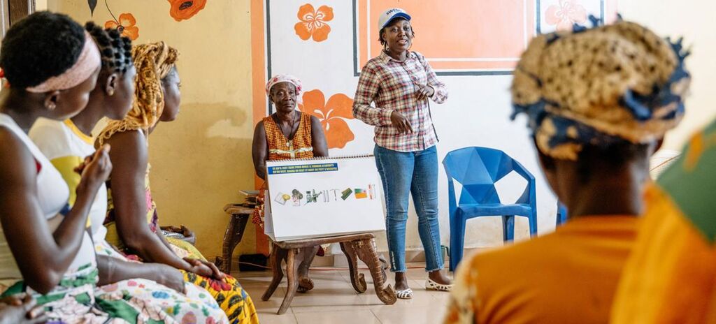 | Des femmes participent à une réunion de l'UNFPA en Côte d'Ivoire sur l'autonomisation des femmes. |