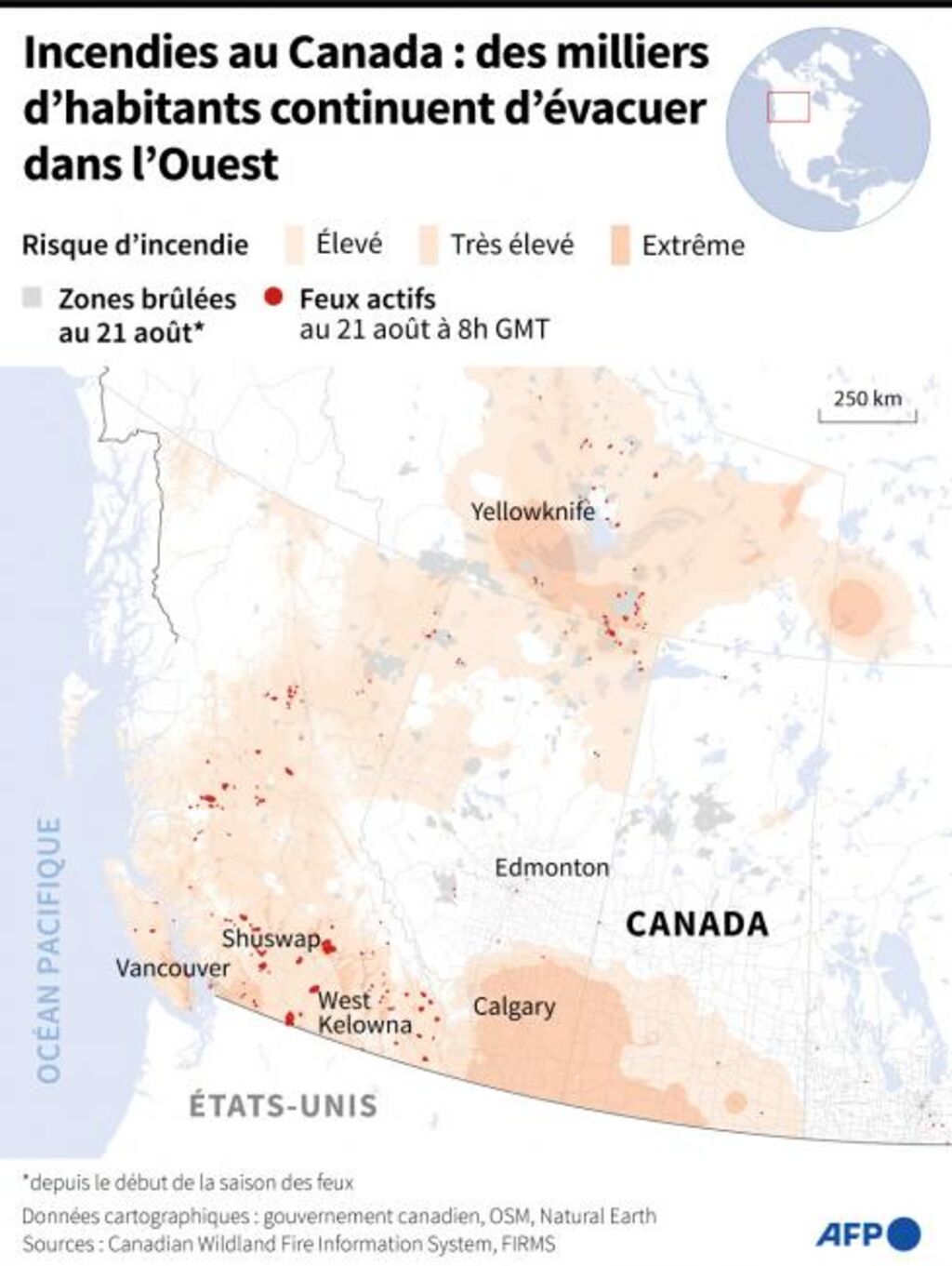 | Carte de l'Ouest du Canada montrant les risques d'incendie, les zones brûlées ainsi que les feux actifs au 21 août. Photo : AFP/VNA/CVN |