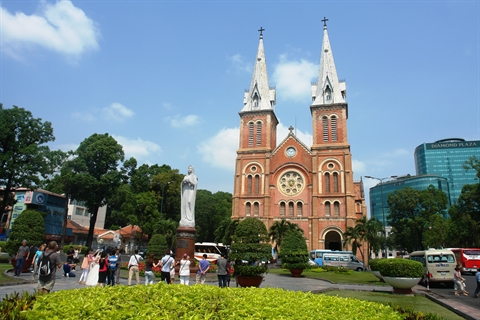 | Des touristes visitent la cathédrale Notre Dame, à Hô Chi Minh-Ville. |