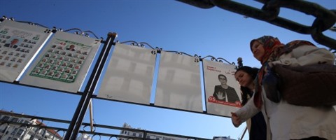 | Les femmes se promènent à travers des affiches de campagne électorale pour les prochaines élections législatives dans les centres d'Alger, en Algérie, le 12 avril 2017. |