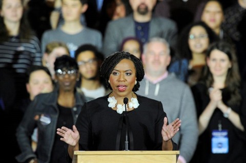 | Ayanna Pressley, première femme noire élue au Congrès pour le Masschusetts, s'adresse à ses partisans à Boston, le 6 novembre. |