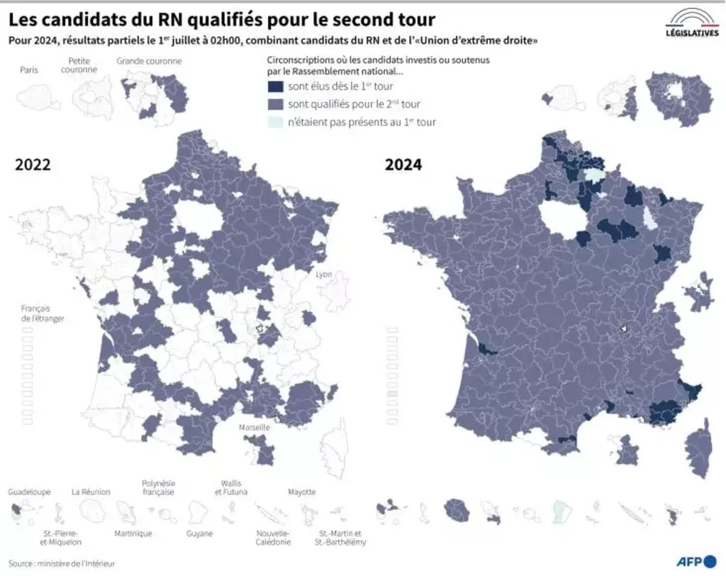 | Candidats du Rassemblement national et de ses alliés ("Union de l'extrême droite") élus à l'issue du premier tour ou qualifiés pour le second tour des élections législatives, par rapport à 2022. |