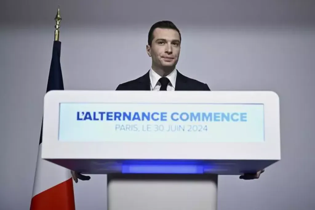 | Le président du Rassemblement national Jordan Bardella prononce un discours au soir des résultats du premier tour des législatives, à Paris le 30 juin. |