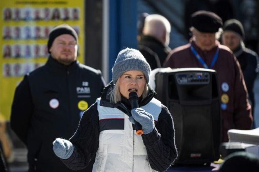 | La cheffe de l'extrême-droite finlandaise, Riikka Purra, s'adresse à ses partisans lors d'un meeting de campagne pour les législatives à Vantaa (Finlande), le 1er avril . |