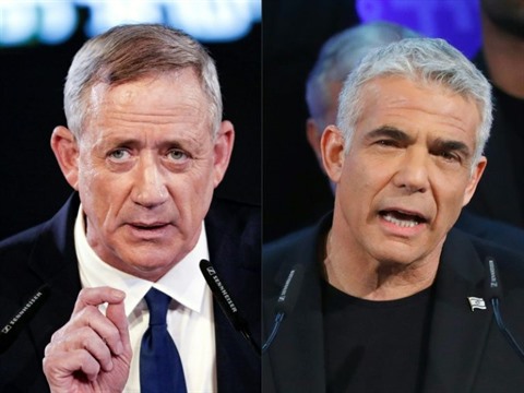 | L'ancien chef d'État-major israélien Benny Gantz (gauche), le 29 janvier à Tel-Aviv, et le chef du parti centriste Yesh Atid, Yair Lapid, le 18 février près de Tel-Aviv. |