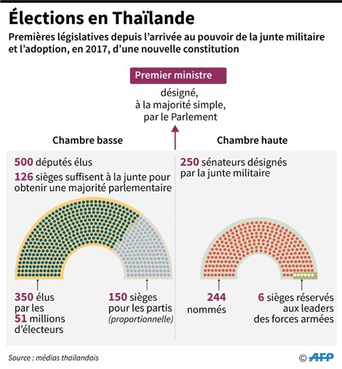 Mais les généraux, qui ont mis en place des politiques de subventions aux agriculteurs et aux plus âgés pour s'attirer leurs voix, entendent bien conserver le pouvoir. Il suffit donc au Phalang Pracharat, le parti pro-junte, d’obtenir 126 sièges sur les 500 que compte la Chambre des représentants pour garder le contrôle du pays.