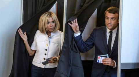 | Le président Emmanuel Macron (droite) et son épouse Brigitte votent pour le premier tour des législatives au Touquet, le 11 juin. |