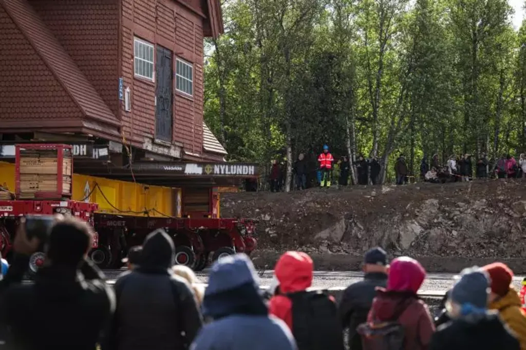 | Des personnes assistent au déplacement de l'église en bois de Kiruna, le 16 août à Kiruna, en Suède. |