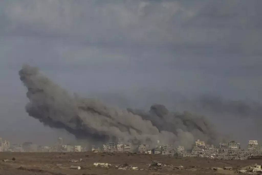 | De la fumée s’élève au-dessus de la bande de Gaza après un bombardement israélien, vue depuis une position du côté israélien de la frontière, le 5 octobre dans le Sud d’Israël. |