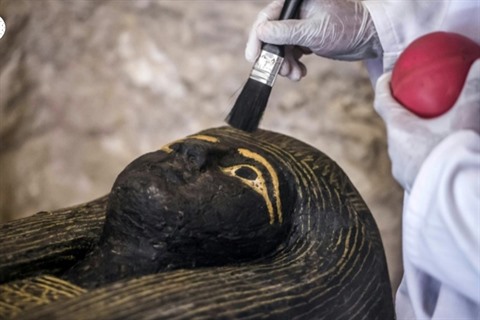 Un archéologue égyptien utilise un pinceau sur le haut d'un sarcophage datant de la basse époque récemment découvert dans la nécropole d'Al-Assasif, à Louxor, dans le Sud de l'Égypte le 24 novembre. Photo: AFP/VNA/CVN |