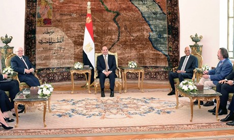 | Une rencontre entre le président égyptien Abdel-Fattah al-Sissi (centre) et le président du Sénat canadien, George Furey (gauche), le 19 mai au Caire. |