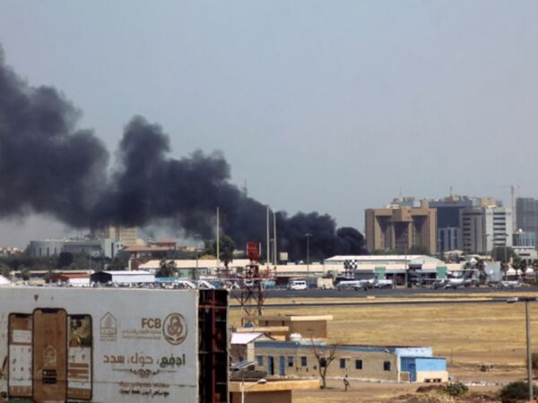 | De la fumée s'élève au-dessus de Khartoum, la capitale du Soudan, en proie à des combats entre l'armée et des paramilitaires, le 16 avril. |